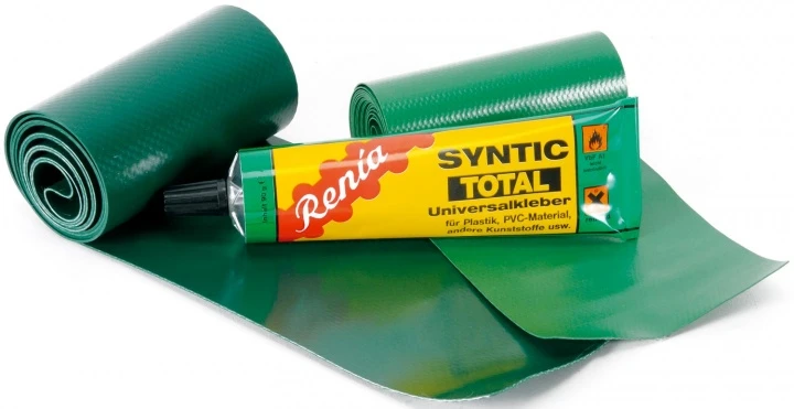 1 Rolle dünne Bootshaut (1 m × 10 cm), 1 Rolle dicke Bootshaut (1 m × 10 cm), 1 Tube Kleber 90 g.