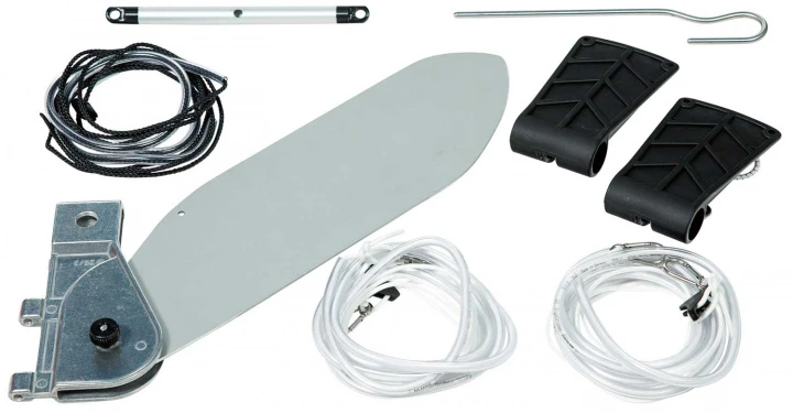 Lieferumfang: 2,5 mm eloxiertes Dural Steuerblatt, Magnesium Steuerkopf, Dural-Querstab, Steuerstift, Steuerleinen mit 2 Karabiner, Aufholerleine, Steuerleinen-Schutzschlauch, 2 Fußpedale für Stemmbügel (Farbe schwarz), Rückspann-Gummikabel mit Karabiner, ca. 1,3 kg.