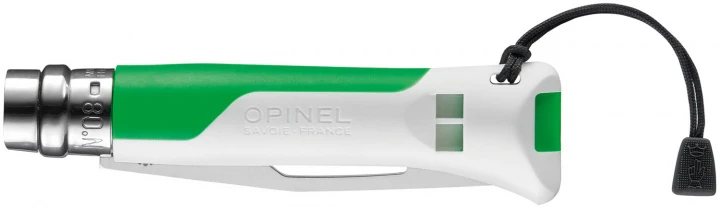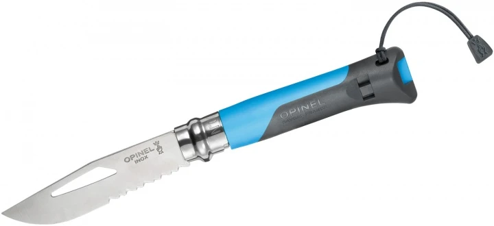 Das Opinel No. 8 Outdoor Messer bietet vielseitige Einsatzmöglichkeiten. Die 2,5 mm starke Klinge besteht aus modifiziertem, rostfreiem Sandvik Stahl 12C27. Die 3,5 cm breiteTeilsägezahnung erlaubt ein leichtes Durchtrennen von Natur- und synthetischenSeilen. Über den in die Klinge integrierten Schäkelöffner werden sich die Segler freuen. Das Virobloc-System arretiert die Klinge sicher im geöffneten undgeschlossenen Zustand. Der Griff im typischen Opinel-Design wird aus einem Polyamid-/Fiberglas-Material gefertigt, das selbst mit nassen Händen gut und fest inder Hand liegt. Eine in den Griff integrierte Signalpfeife und eine Kunststoff-Kordelrunden die umfangreiche Ausstattung ab.