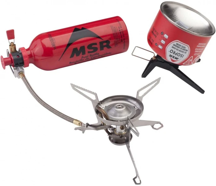 Lieferumfang: Kocher, Windschutz, Kleinteile-Kit, Brennstoffpumpe, Gaskartuschenadapter, Tragebeutel, 0,6 l Flasche.