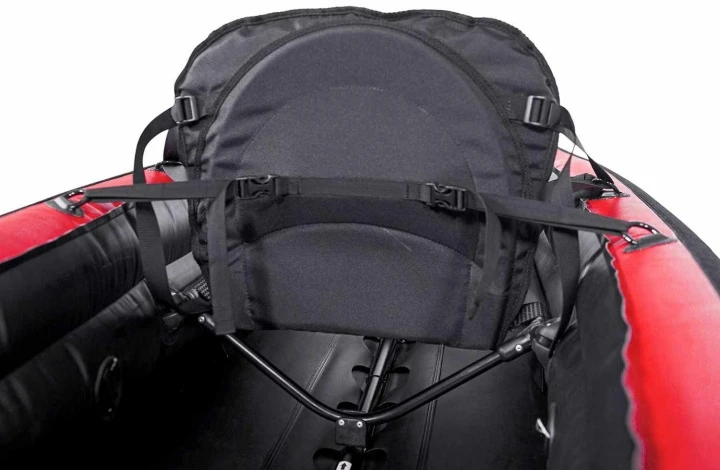 Mit Sitzpolster aus offenzelligem Schaum. Die Rückenlehne ist mit einem Aluminiumrahmen verstärkt, um auch Hochgewachsenen genügend Stabilität zu bieten. Die Lehne kann beim Verstauen/Lagern nicht im Boot verbleiben, sondern muss vor dem Zusammenfalten entfernt werden!