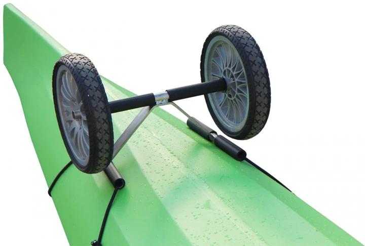 Der V-Shape Bootswagen ist speziell für schlanke Boote mit Seekajak-Kiellinie entwickelt worden. Mit dem starkem, elastischem Gummi ist er binnen Sekunden am Boot befestigt.