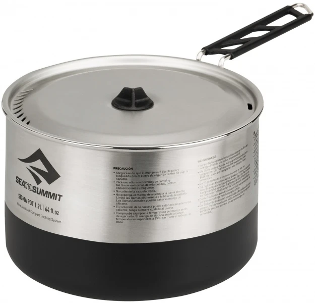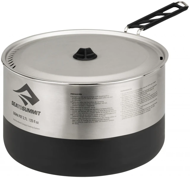 Die verschiedenen Größen sind ineinander nestbar. Eingravierte Maßeinheiten, das gravierte Muster an der Topfunterseite hält den Topf stabil auf jedem Campingkocher. Die SigmaPots™ sind mit den SigmaPans™ und den Aluminium AlphaPots™ und AlphaPans™ kompatibel (passen ineinander).